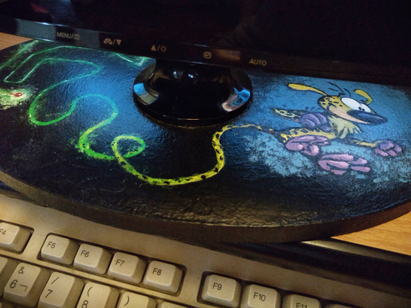 Base en bois pour moniteur d'écran PC, qui recrée l'image de Marsupilami (Image02-détail)